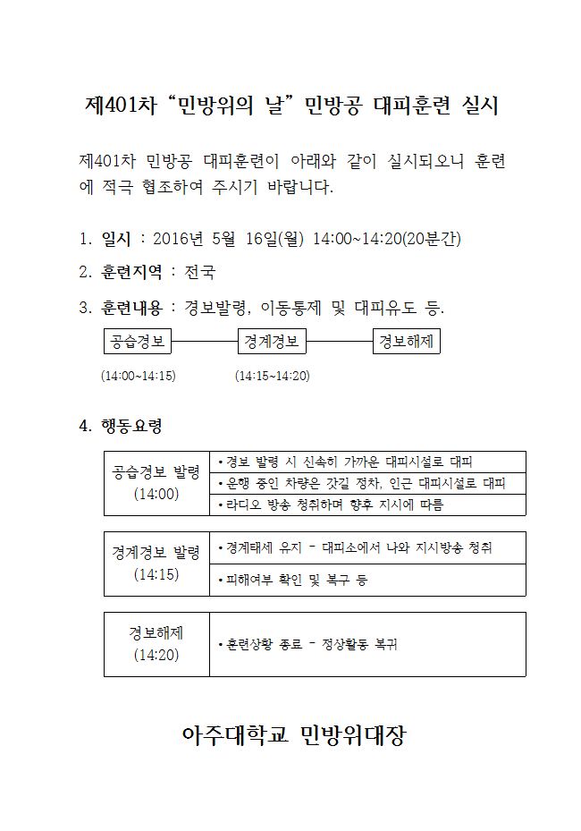 제401차 민방위의 날 민방공대피훈련 실시 안내