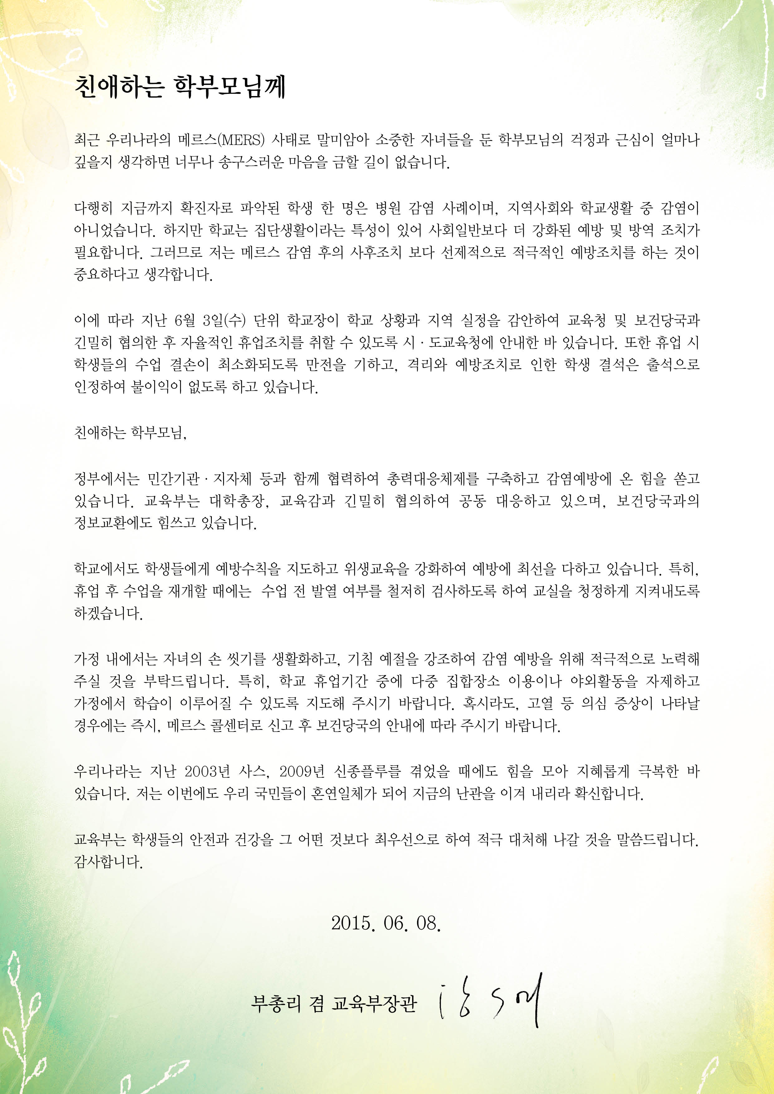 메르스 관련 부총리 겸 교육부장관 서한문
