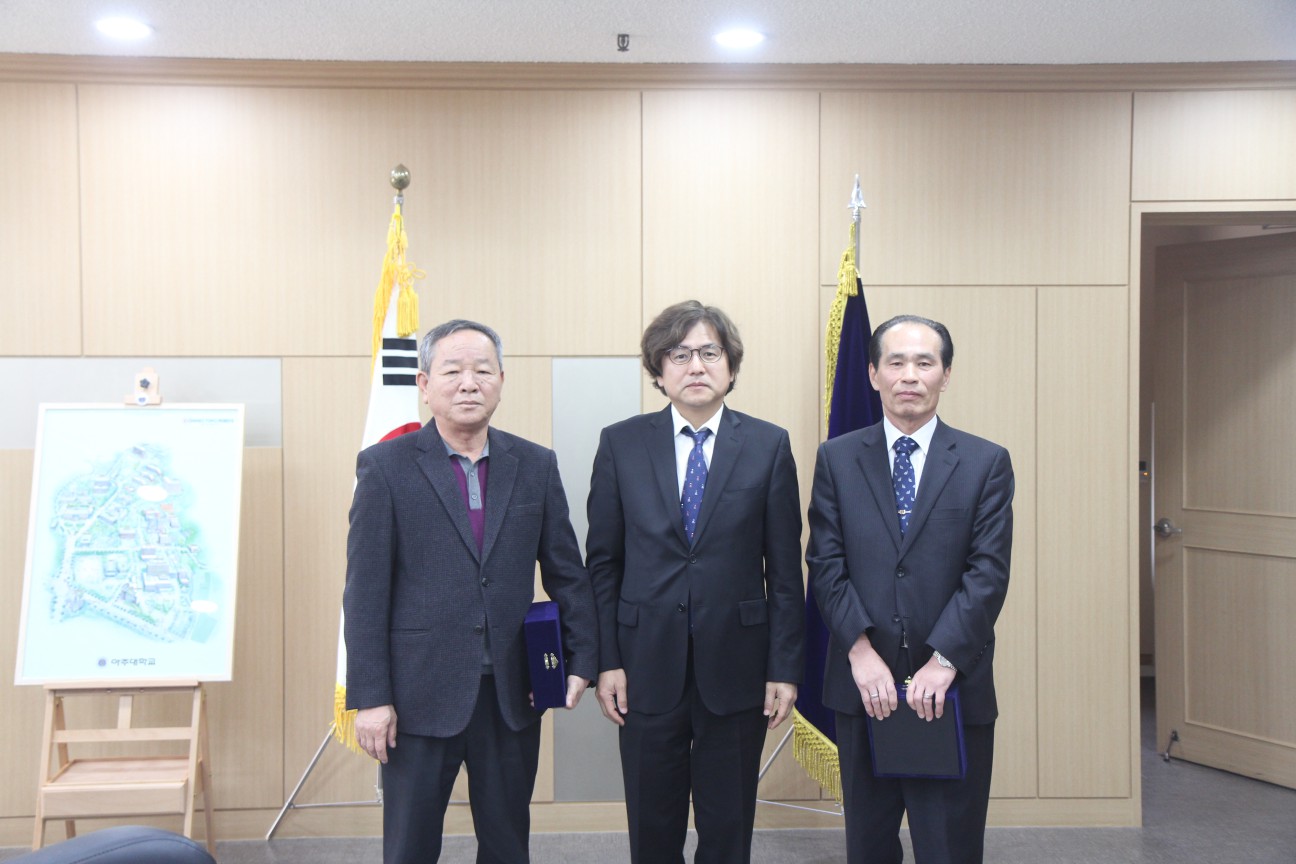 2018학년도 2학기를 끝으로 정년퇴임하는 우리 학교 교원들에게 감사의 마음을 전하기 위해 뜻깊은 행사가 마련됐다.26일 마련된 정년 기념 오찬에는 박형주 총장과 김혜선 대학원장, 장우진 교무처장 등 각 대학 학장과 처장단, 학과장이 함께 자리해 감사 인사를 전했다.지난 학기를 마지막으로 강단을 떠나는 교수는 5명으로 조영호 교수(경영학과)와 이재식 교수(e-비즈니스학과), 조광순 교수(영어영문학과), 강충권 교수(불어불문학과), 김호섭 교수(행정학과)다.이날 오찬 행사에서는 퇴임 교원들에 대한 감사패와 기념품 전달식에 이어 ▲박형주 총장의 인사말 ▲퇴임교원의 고별사가 별도로 마련됐다.정년퇴임을 맞은 교수들은 재직기간에 따라 훈장을 받았다. ▲옥조근정훈장(재직 33년 이상~35년 미만) - 김호섭·조광순 교수 ▲근정포장(재직 30년 이상~33년 미만) - 강충권 교수 ▲대통령표창(재직 28년 이상~30년 미만) - 이재식 교수다.*아주대학교 소식지 2019 신년호 - 조영호 교수 기고 보기 "그래도 나는 꿈꾸는 아주가 좋습니다"