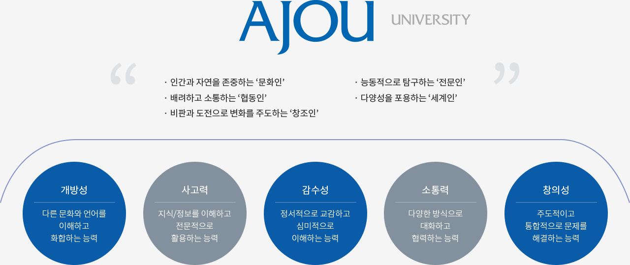 • 교육목적 구현을 위해 대학의 인재상을 '실사구시의 융복합 창조인'을 의미하는 '다산형 인재'로 설정