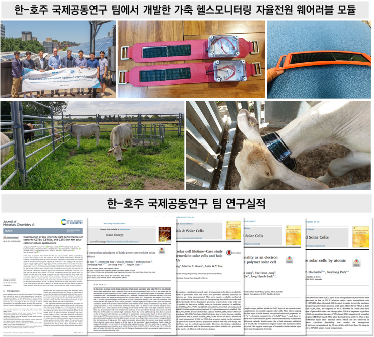 우리 학교 김종현 교수 연구팀이 호주 연구팀과 공동으로 가축의 질병과 건강을 진단할 수 있는 태양전지 기반 자율전원 웨어러블 모듈의 핵심기술을 개발하는 데 성공했다. 이에 대규모 농가에서 가축의 건강상태를 실시간으로 진단 및 예측할 수 있는 첨단 플랫폼 구축에 활용될 전망이다. 김종현 교수(응용화학생명공학과·대학원 분자과학기술학과)는 소속된 공동 연구팀이 CZTS 기반 저조도 태양전지에 대한 연구결과를 <저널 오브 머터리얼즈 케미스트리 에이(Journal of Materials Chemistry A), 임팩트팩터: 11.301, JCR상위 6.7%> 7월21일자 온라인판에 게재했다고 밝혔다.논문은 “케스테라이트 구조 CZTS(Se) 박막태양전지의 저조도 출력원리에 관한 연구(Investigation of Low Intensity Light Performances of Kesterite CZTSe, CZTSSe, and CZTS Thin Film Solar Cells for Indoor Applications)”다. 이번 연구에는 아주대와 녹색에너지연구원, 전남대, 그리고 호주 뉴사우스웨일즈대학이 참여했다.연구팀은 실내 저조도 환경에서도 널리 활용될 수 있는 CZTS(Se) 기반 태양전지의 원리를 최초로 규명했다. CZTS 박막 기반 태양전지는 저비용의 친환경 광흡수 소재로, 기존 고비용 혹은 중금속 기반의 환경유해성 태양전지를 대체할 차세대 태양전지로 주목받아왔다. CZTS 태양전지는 높은 광량을 가지는 실외 태양광 하에서는 우수한 광전변환효율을 나타내는 것으로 잘 알려져 왔으나, 흐린 날 혹은 실내조명 등 저조도 환경에서의 활용 가능성에 대한 연구는 충분하지 않았다. 이에 공동 연구팀은 전략적으로 저조도 환경에서도 널리 활용될 수 있는 CZTSSe 박막을 제작함으로써, 이 박막이 저조도 환경에서도 사물인터넷(IoT) 센서를 구동할 수 있는 수준으로 전력생산이 가능함을 규명했다. CZTSSe 박막 기반 태양전지가 실내 및 실외에서 사용되는 다양한 사물인터넷(IoT) 센서의 구동용 자율전원소자로 활용될 수 있음을 밝혀낸 것. 돼지열병, 구제역 등 가축 질병의 발생을 예방하고 추가 확산을 막기 위해, 더불어 동물 복지 향상을 위해서는 실내외의 다양한 축산환경에서 가축의 건강상태를 실시간으로 진단 및 예측할 수 있는 효율적 모니터링 시스템이 필요하다. 김종현 교수 연구팀은 그동안 글로벌 산학연 연구그룹을 꾸려 가축 헬스 모니터링 시스템 구축을 위한 여러 연구를 함께 진행해왔다. 이에 아주대(김종현 교수)·전남대(김진혁 교수), 전자부품연구원(김진철 박사, 박노창 박사)·녹색에너지연구원(박종성 박사), ㈜대연씨앤아이 그리고 호주 뉴사우스웨일즈대학(University of New South Wales)·퀸즈랜드대학(University of Queensland) 연구진이 공동 연구에 참여해왔다. 공동 연구팀은 가축의 다양한 생활환경과 넓은 생활반경을 고려해 환경에 제약을 받지 않고 전원을 안정적으로 공급할 수 있는 무선형 독립전원시스템을 개발해왔다. 동시에 가축이 착용할 수 있는 센서를 개발, 가축 건강 진단용 자율전원 웨어러블 센서 모듈을 제작해 호주에서 실증 연구에 돌입했다. 농가에서는 센서를 통해 개별 가축의 상태를 확인할 수 있다.이러한 센서 모듈에 사용되는 무선 자율전원의 핵심은 실내외에서 활용 가능한 태양전지로 공동 연구팀은 앞서 실내외에서 우수한 출력을 내는 페로브스카이트 태양전지를 개발, 저명 학술지 <나노 에너지(Nano Energy)> 2020년 2월호에 발표하기도 했다. 개발된 태양전지의 실질적 응용을 위한 봉지기술에 대해서도 지속적으로 연구를 이어와 관련 성과를 <솔라 에너지 머터리얼즈 앤드 솔라 셀즈(Solar Energy Materials & Solar Cells)> 2018년 12월호에 발표한 바 있다.김종현 교수는 “그동안의 연구를 기반으로 태양전지 기반 무선자율전원형 웨어러블 센서 모듈을 자체 개발, 호주 브리즈번 소재 가축 농장의 소에 착용시켜 실증 연구를 진행하고 있다”며 “호주 다른 지역의 가축 농가에서 대형 규모 실증 연구에도 돌입할 계획”이라고 설명했다.공동 연구팀은 호주 대형 축산농가에서 실질적으로 필요로 하는 기술을 이해하고 이를 개발하기 위해 주기적인 자체 연구 교류회를 개최하고 있다. 호주는 가축산업이 발달한 농업 테크놀로지 분야 선진국으로 가축의 건강 진단을 통한 농가 소득 증대에 관심이 매우 높다. 연구팀은 호주 뉴사우스웨일즈 나로민(Narromine)시와 시장 크레이그 데이비스(Craig Davies)의 추가적인 지원을 받아 실증 연구단지의 확장을 계획하고 있다. 김종현 교수는 “연구팀이 웨어러블 가축 건강 진단 모듈의 최종 제품 개발에 성공할 경우, 호주 농축산업계에서의 상용화 가능성이 매우 높다”며 “실증 연구를 통해 나온 빅데이터 분석기술에 현재 계획 중인 AI 기반 분석 기술을 추가로 도입해, 국가별·가축별 질병·건강진단 플랫폼을 구축해갈 계획”이라고 밝혔다. 관련 연구결과들은 산업통상자원부·한국산업기술진흥원 지원 국제공동기술개발사업 (P0006857)과 과학기술정보통신부·한국연구재단 지원 한-오세아니아 협력기반조성사업(NRF-2018K1A3A1A17081404)을 바탕으로 수행되었다.